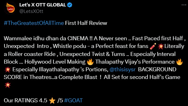 தமிழகத்தில் காலை 9 மணிக்கு தான் முதல் காட்சி. ஆனால், மற்ற மாநிலங்களிலும், வெளிநாடுகளிலும் GOAT படத்திற்கு அதிகாலை 4 மணி காட்சி தரப்பட்டுள்ளது. இந்த நிலையில், அதிகாலை 4 மணி காட்சியில் படம் பார்த்த ரசிகர்கள் முதல் பாதி படம் எப்படி இருக்கிறது என்பது குறித்து எக்ஸ் வலைத்தளத்தில் தங்களது விமர்சனத்தை தெரிவித்துள்ளனர்