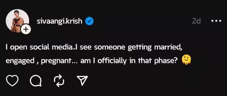 அந்த பதிவில் சிவாங்கி “நான் சமூக வலைதளங்களை ஓபன் செய்தாலே திருமண செய்திகள், நிச்சயதார்த்த செய்திகள், கர்பமாக இருக்கும் செய்திகள்தான் குவிகின்றன. நான் இப்போது கட்டத்தில்தான் இருக்கிறேனா?” என்று கேட்டிருக்கிறார். இதனால், இவரும் ஒரு வேலை திருமண செய்தி கூறுவாரோ என பலர் பேசி வருகின்றனர்.
