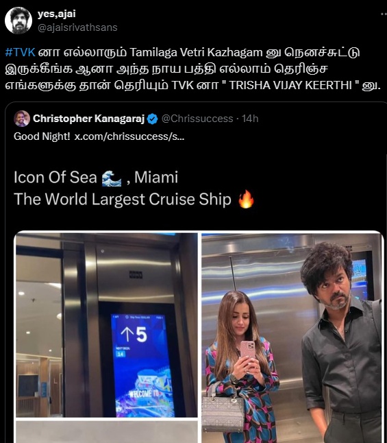 மேலும் விஜய் – கீர்த்தி சுரேஷ் இடையே இருக்கும் உறவை குறிப்பிட்டு, விஜய்யின் கட்சி பெயர் தமிழக, வெற்றிக் கழகம் இல்லை, த்ரிஷா, விஜய், கீர்த்தி என்றும் சிலர் கருத்து பதிவிட்டு வருகின்றனர்.