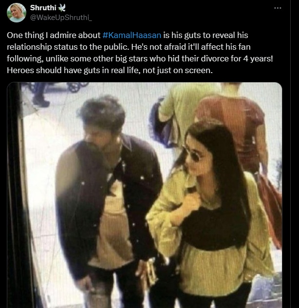 இந்த நிலையில் விஜய்யும் த்ரிஷாவு ஒன்றாக செல்லும் புகைப்படம் இணையத்தில் மீண்டும் வைரலாகி உள்ளது. இந்த போட்டோவை பதிவிட்டுள்ள பயனர் “கமல்ஹாசனைப் பற்றி நான் போற்றும் ஒரு விஷயம் என்னவென்றால், தனது உறவு நிலையைப் பொதுமக்களுக்கு வெளிப்படுத்தும் துணிச்சல். விவாகரத்தை 4 வருடங்களாக மறைத்த மற்ற சில பெரிய நட்சத்திரங்களைப் போலல்லாமல், இது அவரது ரசிகர்களைப் பாதிக்கும் என்று அவர் பயப்படவில்லை! ஹீரோக்களுக்கு திரையில் மட்டுமல்ல நிஜ வாழ்க்கையிலும் தைரியம் இருக்க வேண்டும்.” என்று பதிவிட்டிருந்தார்.