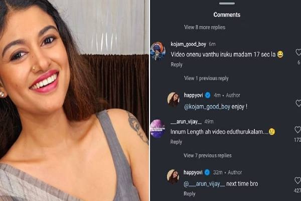 வீடியோ ஒன்று வந்திருக்கிறது மேடம் என்று சொல்ல, அதற்கு எஞ்சாய் என்று பதில் அளித்துள்ளார். அதேபோல், இன்னும் கொஞ்சம் லென்த்தா எடுத்திருக்கலாம் என்று சொல்ல, நெக்ஸ்ட் டைம் ப்ரோ என்று பதிவிட்டுள்ளார். இந்த பதிவு தற்போது வைரலாகி வருகிறது