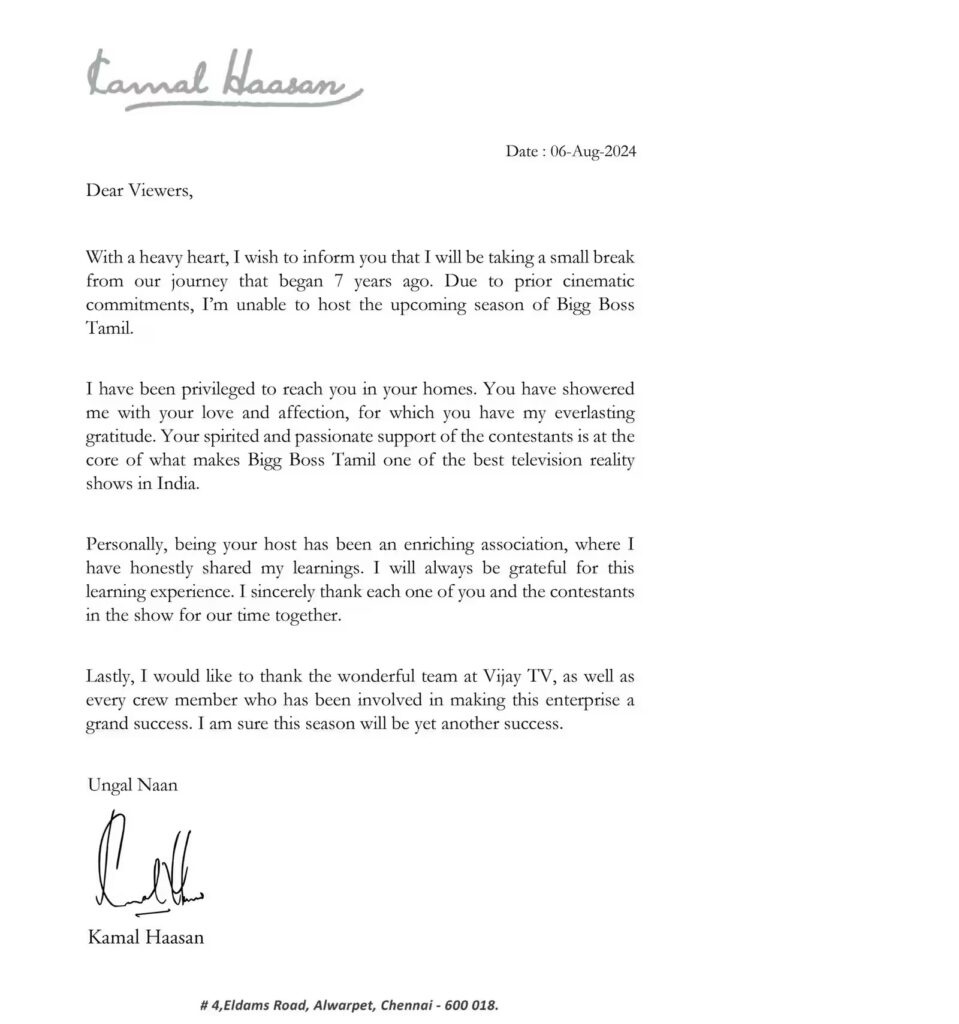 மேலும் இந்த நிகழ்ச்சியின் சிறப்பாக அமைந்தது, அதை தொகுத்து வழங்கிய உலகநாயகன் கமலஹாசன் என்றால் அது மிகையல்ல. இந்நிலையில் சுமார் 7 ஆண்டுகள் கழித்து, பிக் பாஸ் நிகழ்ச்சியில் இருந்து தான் விலகுவதாக உலகநாயகன் கமல்ஹாசன் அறிவித்திருக்கிறார். இது குறித்து அவர் வெளியிட்ட பதிவில் பின்வருமாறு கூறியுள்ளார்....