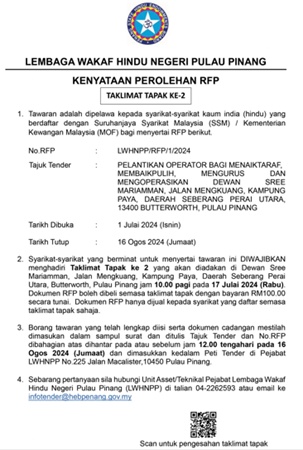 பினாங்கு, பட்டர்வொர்த், செபராங் பேராய் உதரா,கம்போங் பாயா, ஜாலான் மெங்குவாங் – கில் வீற்றிருக்கும் டேவான் ஸ்ரீ மாரியம்மன் மண்டபத்தின் தரத்தை உயர்த்துதல், பழுது பார்த்தல், நிர்வகித்தல் மற்றும் வழிநடத்துதல் ஆகியவற்றுக்கான ஆப்பரேட்டர்கள் நியமனம் தொடர்பான டெண்டர் முன்மொழிவுக்கான கோரிக்கை விபர அறிக்கையை பினாங்கு இந்து அறப்பணி வாரியம் வெளியிட்டுள்ளது.