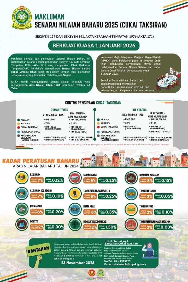 கூலிம் மாவட்டத்திலுள்ள வீடுகள், நிலங்கள் மற்றும் தொழிற்பேட்டைகள் என 12 பிரிவுகள், வீட்டு வரி உயர்வில் சம்பந்தப்பட்டு இருப்பதையும் அவர் விளக்கினார். இது தொடர்பாக கூலிமில் உள்ள அனைத்து சொத்துடமையாளர்களுக்கும் முன் அறிவிப்பு வழங்கப்படும் என்பதையும் டத்தோ எல்மி தெளிவுபடுத்தினார்.