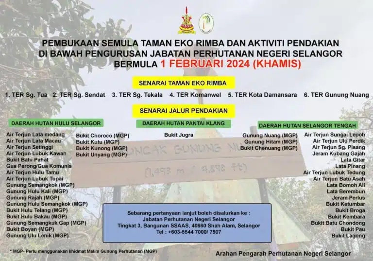 Sungai Tua, Sungai Sendat, Sungai Tekala, Komanwel, Kota Damansara, Gunung Nuang ஆகிய இடங்கள் எதிர்வரும் பிப்ரவரி 1 முதல் திறந்திருக்கும் என முகநூலில் அவ்விலாக்கா குறிப்பிட்டுள்ளது.