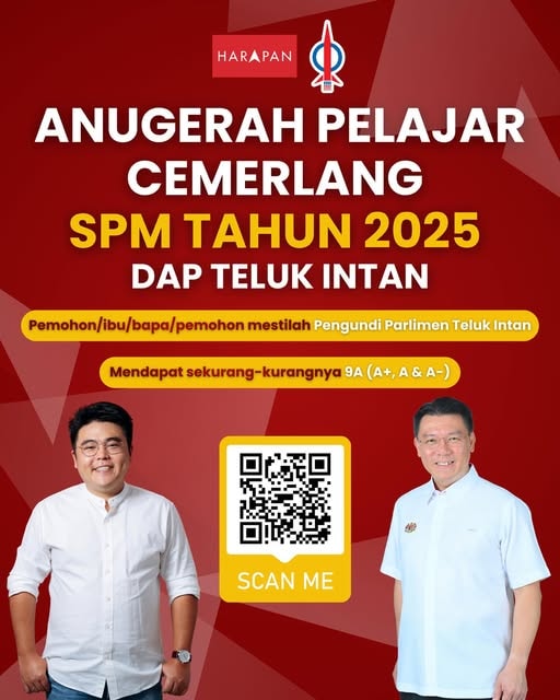 2025-ஆம் ஆண்டுக்கான எஸ்.பி.எம். தேர்வு முடிவுகள் நேற்று வெளியான நிலையில், சிறந்த முடிவுகளைப் பெற்றுச் சாதனைப் படைத்த மாணவர்களைப் பாராட்டி ஊக்கப்படுத்தும் வகையில், ' ஜசெக தெலுக் இந்தான் சிறந்த மாணவர்களுக்கான விருது' அறிவிக்கப்பட்டுள்ளது.