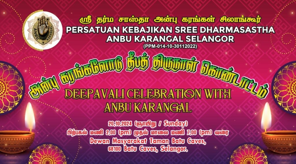 ஸ்ரீ தர்ம சாஸ்தா அன்பு கரங்கள் சிலாங்கூர் அமைப்பின் அன்பு கரங்களோடு தீபத் திருநாள் கொண்டாட்டம் எனும் தீபாவளி அன்பளிப்பு வழங்கும் நிகழ்வு, வரும் அக்டோபர் 20 ஆம் தேதி ஞாயிற்றுக்கிழமை பிற்பகல் மணி 2 முதல் மாலை 7 மணி வரை பத்து கேவ்ஸ், டெவான் மஸ்யராகத் தமன் கேவ்ஸ் கேவ்ஸ் என்ற முகவரியில் உள்ள மண்டபத்தில் வெகு சிறப்பாக நடைபெறவிருக்கிறது.