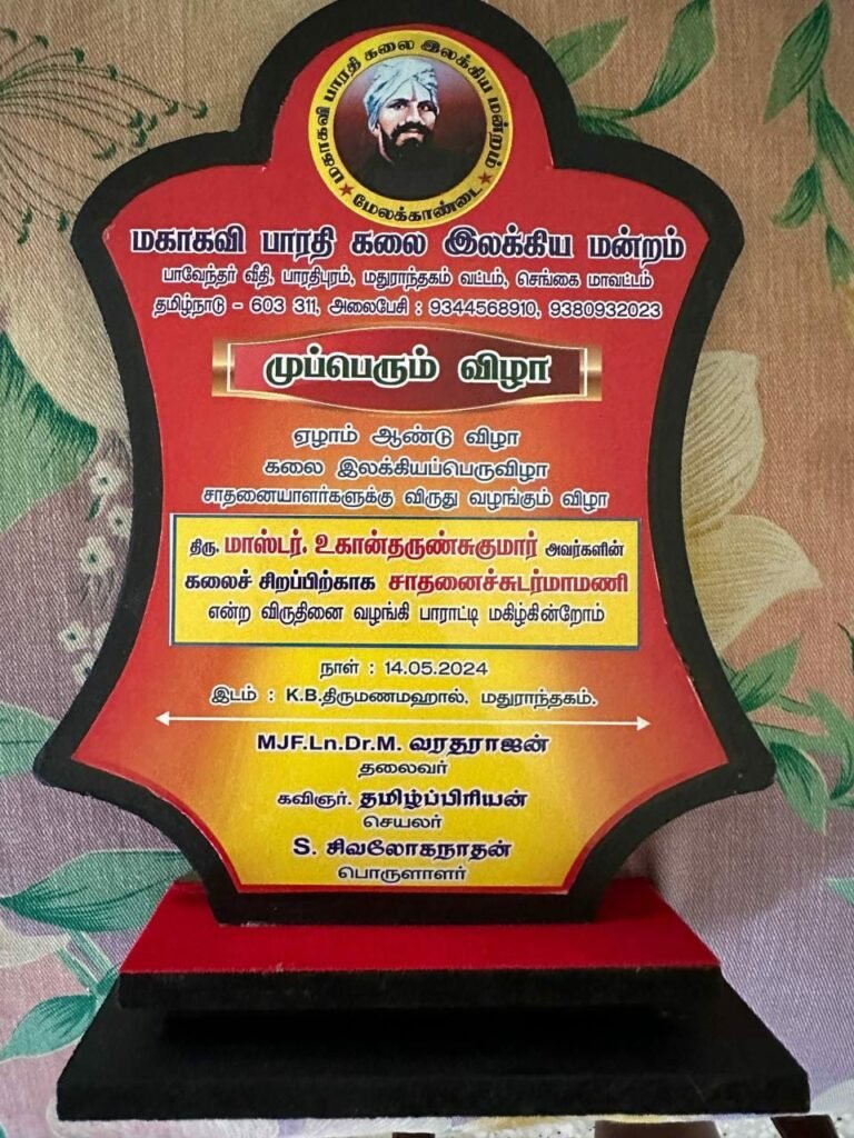 கடந்த மே 14 ஆம் தேதி சென்னை, மதுராந்தகம், கே.பி. திருமணமஹாலில், மகாகவி பாரதி கலை இலக்கிய மன்றத்தின் ஏற்பாட்டில் நடைபெற்ற ஏழாம் ஆண்டு முப்பெரும் விழாவில் மாஸ்டர் உகான்தருண்சுகுமாருக்கு இவ்விருது வழங்கப்பட்டு சிறப்பு செய்யப்பட்டது.