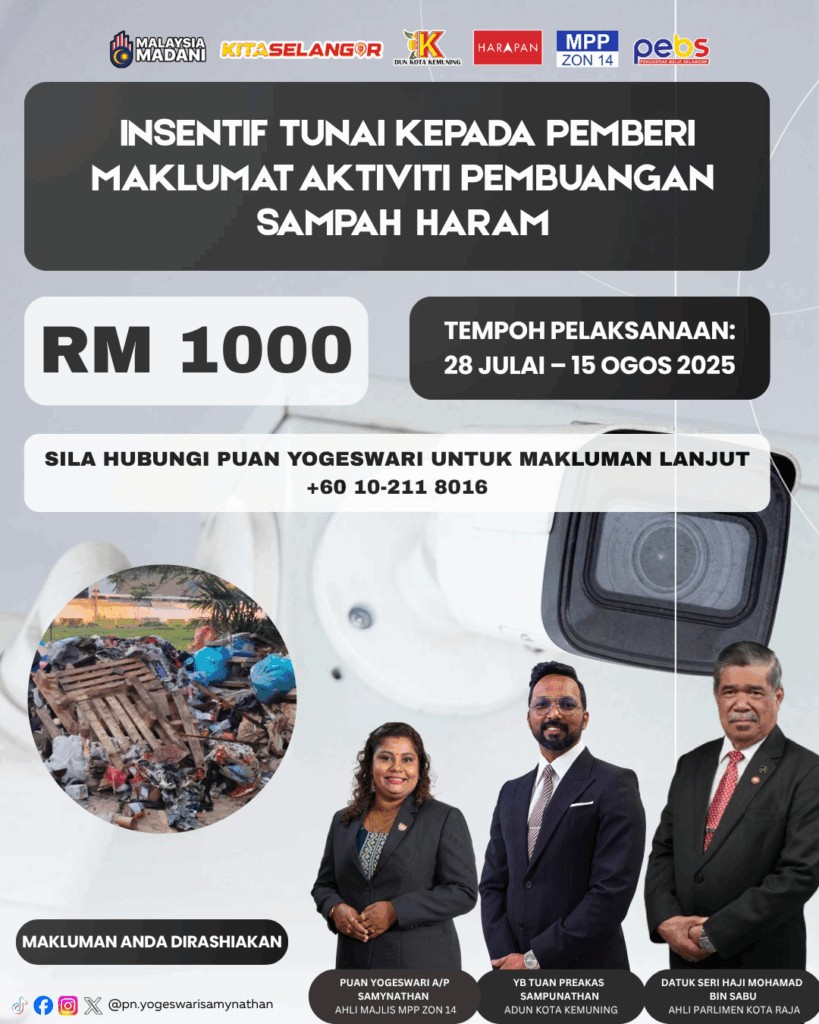 சட்டவிரோதமாகக் குப்பைகளை வீசுவோரைச் சட்டத்தின் பிடியில் நிறுத்தி அவர்களுக்கு தகுந்த தண்டனை கிடைப்பதற்கு ஏதுவாக தேவையான ஆதாரங்களை வழங்குவோர் இந்த 1,000 வெள்ளி வெகுமதிக்கு தகுதியானர்கள் என்று யோகேஸ்வரி தெரிவித்தார்.