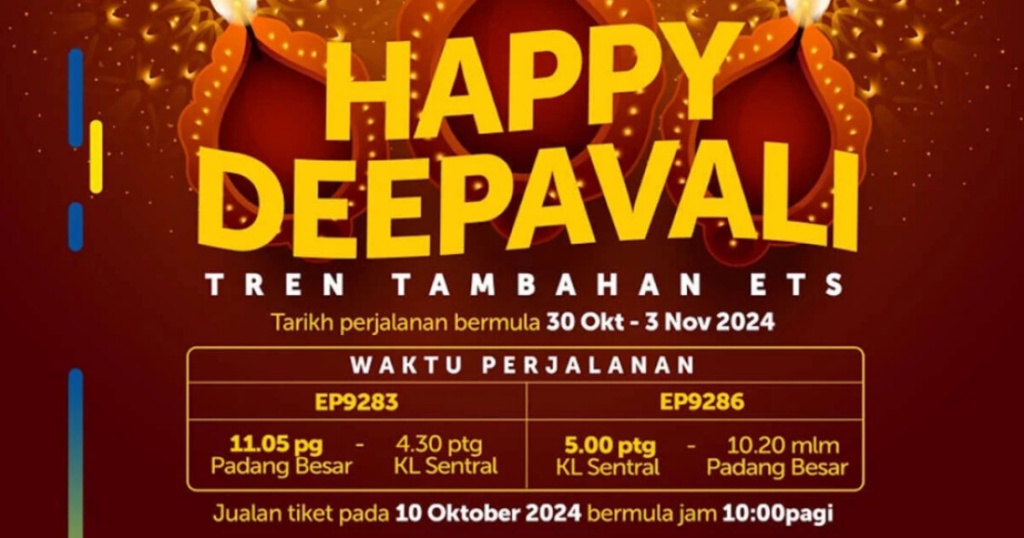 இம்மாதம் பிற்பகுதியில் கொண்டாடப்படவிருக்கும் தீபாவளி திருநாளை முன்னிட்டு மலாயன் ரயில்வே பெர்ஹாட்டான KTM, கோலாலம்பூர் செண்ரல் நிலையத்திற்கும், பதங் பெசார்- ருக்கும் இடையில் கூடுதலாக இரண்டு ETS மின்சார ரயில் சேவையை வழங்கவிருக்கிறது.