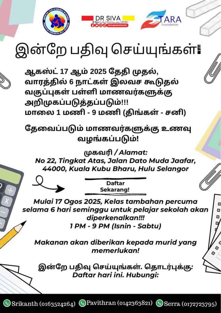 கல்விதான் அழியாதச் செல்வம் என வள்ளுவர் சொன்னதை மெய்ப்பிக்கும் வகையில், கோல குபு பாரு வட்டார மாணவர்களுக்கு ஒரு பொன்னான வாய்ப்பு. எதிர்வரும் ஆகஸ்ட் 17 முதல், தாரா அறக்கட்டளை, பெர்சத்துவான் பெர்பாடுவான் உலு சிலாங்கூர், டாக்டர் சிவா பிரகாஷ் அவர்களின் இணை முயற்சியால், அனைத்து தொடக்கப்பள்ளி, இடைநிலைப் பள்ளி மாணவர்களுக்கும் முற்றிலும் இலவச டியூஷன் வகுப்புகள் தொடங்கப்படவுள்ளன.