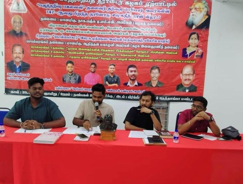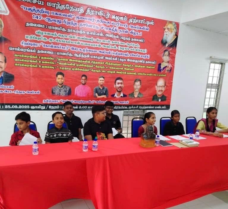 மலேசிய மாந்தநேயத் திராவிடர் கழகத்தின் ஏற்பாட்டில், ‘பகுத்தறிவுப் பகலவன்’ தந்தை பெரியார் அவர்களின் 147- ஆவது பிறந்தநாள் விழா, கழகத் தலைவர், மானமிகு. நாக.பஞ்சு அவர்களின் தலைமையில், கடந்த 28.9.2025 ஆம் நாளன்று நண்பகல் 2.30 மணியளவில், கோலாலம்பூர், பிரிக்பீல்ஸ் பாடாங் பெலியா சாலையில் அமைந்துள்ள ருக்குன் தெத்தாங்கா மண்டபத்தில் சிறப்பாக நடைபெற்றது.