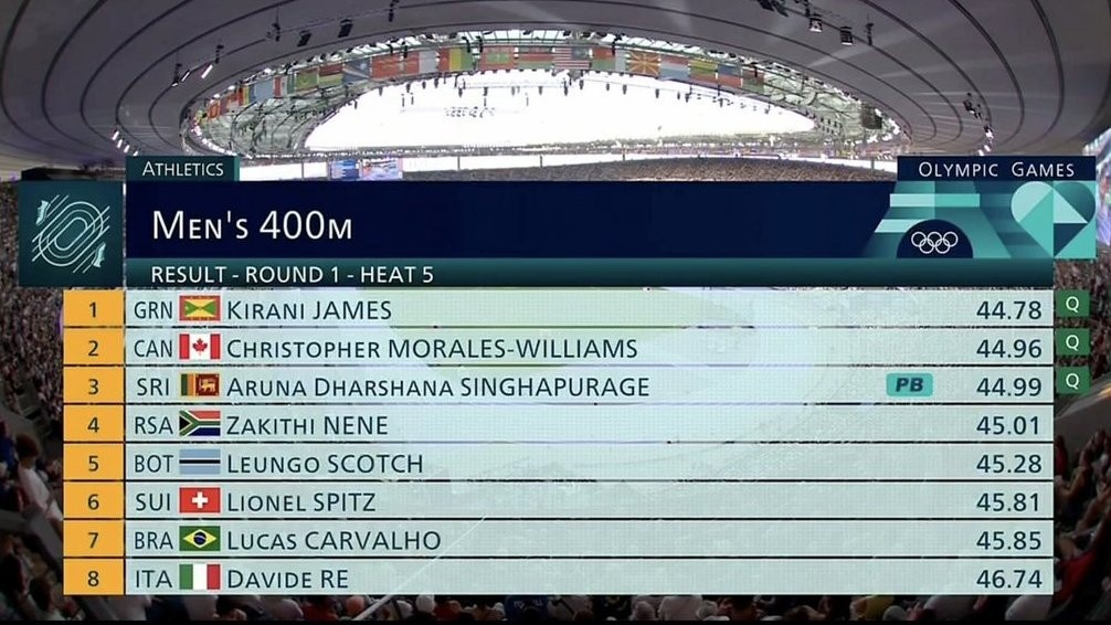 பரிஸ் ஒலிம்பிக்கில் ஆடவருக்கான 400 மீற்றர் ஓட்டப் போட்டியில் இலங்கையை பிரதிநிதித்துவப்படுத்திய அருண தர்ஷன அரையிறுதி சுற்றுக்கு தகுதி பெற்றுள்ளார்.